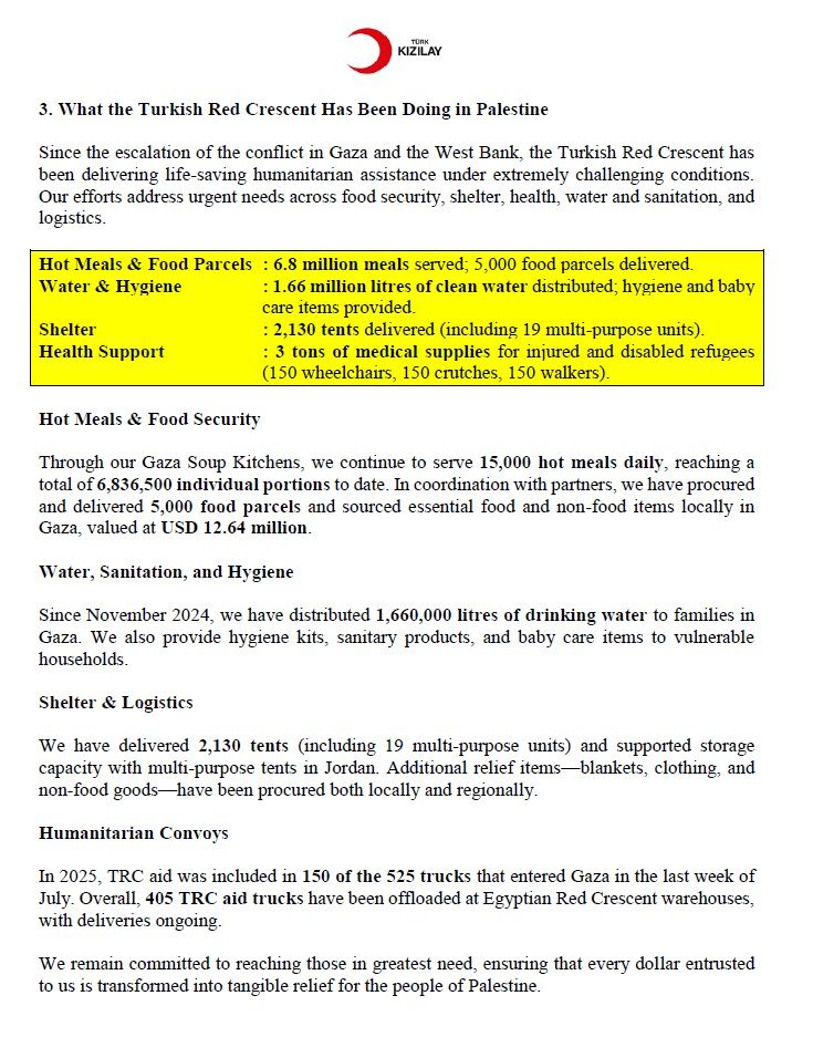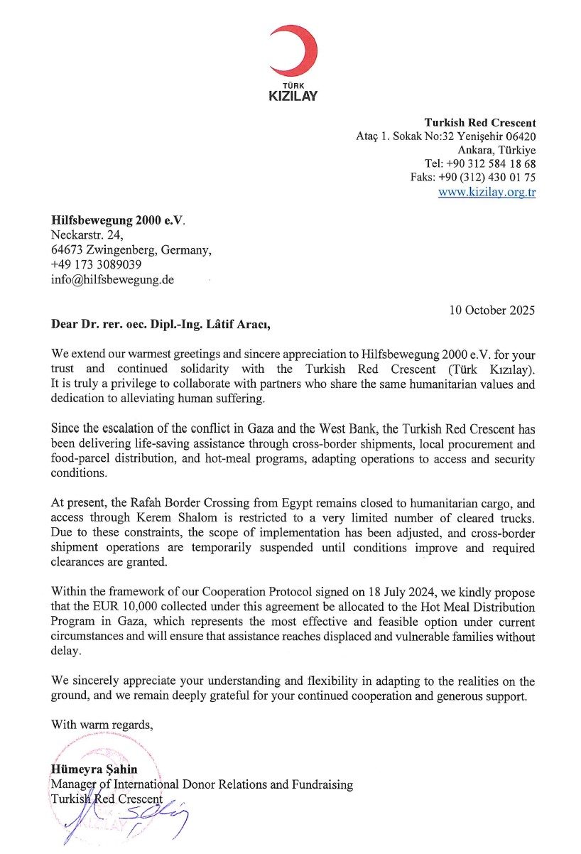 Der Gesamtbetrag in Höhe von 12.210,- € wurde an KIZILAY (Türkischer Roter Halbmond), gemäß der Kooperationsvereinbarung zur Essensausgabe an die notleidende Bevölkerung in Gaza, überwiesen.