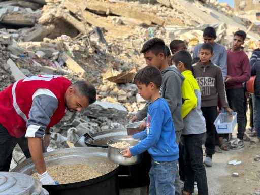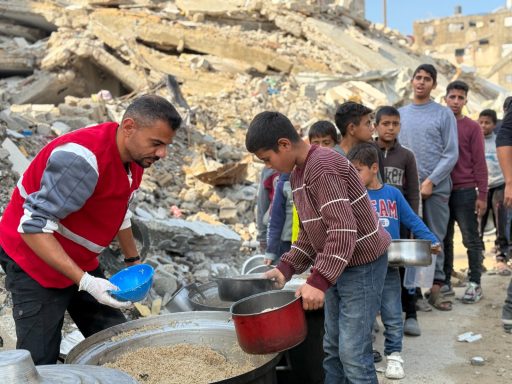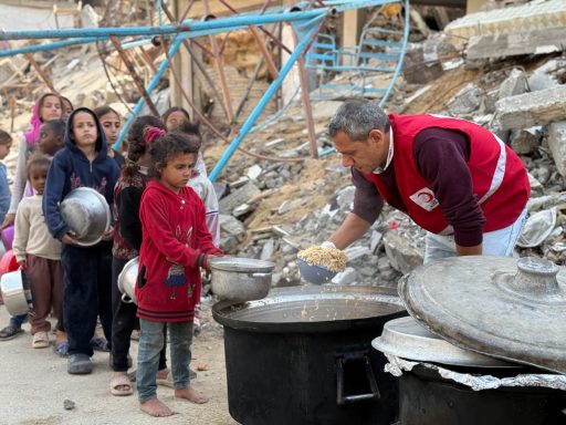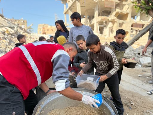 9. Abladen der Hilfsgüter und Versorgung der Bevölkerung in Gaza. International Red Cross and Red Crescent Movement.