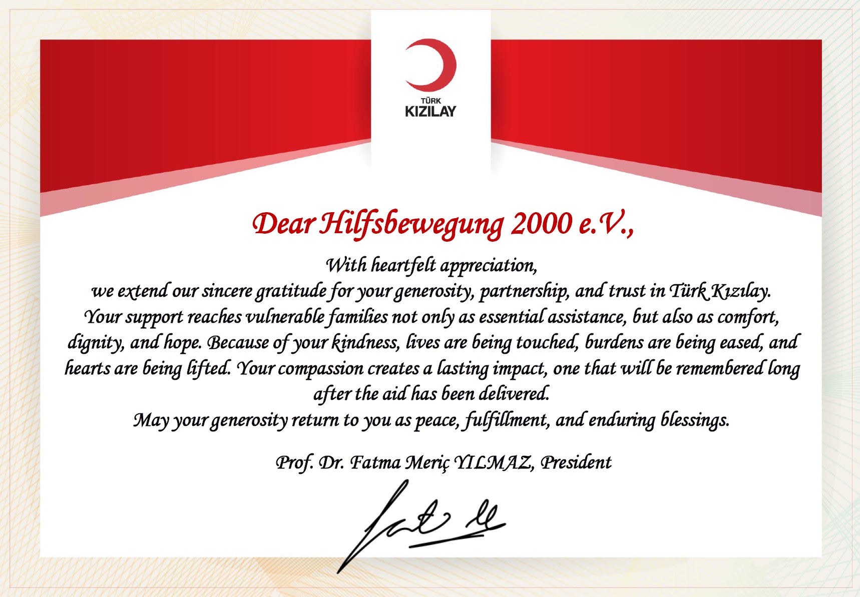 1. Alle bei der Hilfsbewegung 2000 e.V. eingegangenen Spenden werden zu 100% an den Türkischen Roten Halbmond KIZILAY weitergeleitet.